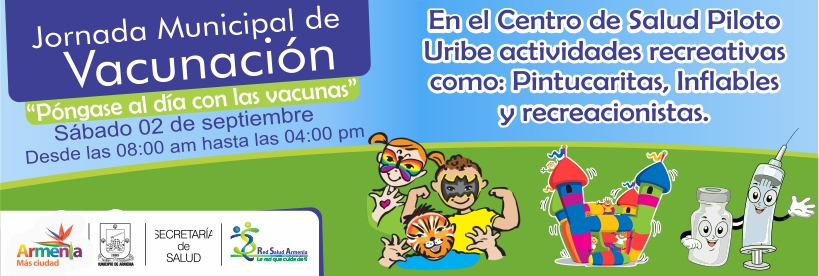 Con la participación de la SecretarÃa de Salud Municipal y Red Salud Armenia ESE, se realizará el próximo sábado 02 de septiembre, desde las 08:00 AM hasta las 04:00 PM, la Jornada Municipal de Vacunación “Póngase al dÃa con las vacunasâ€, la cual fue convocada por la alcaldÃa de Armenia a través de la Resolución 025 de 2017.