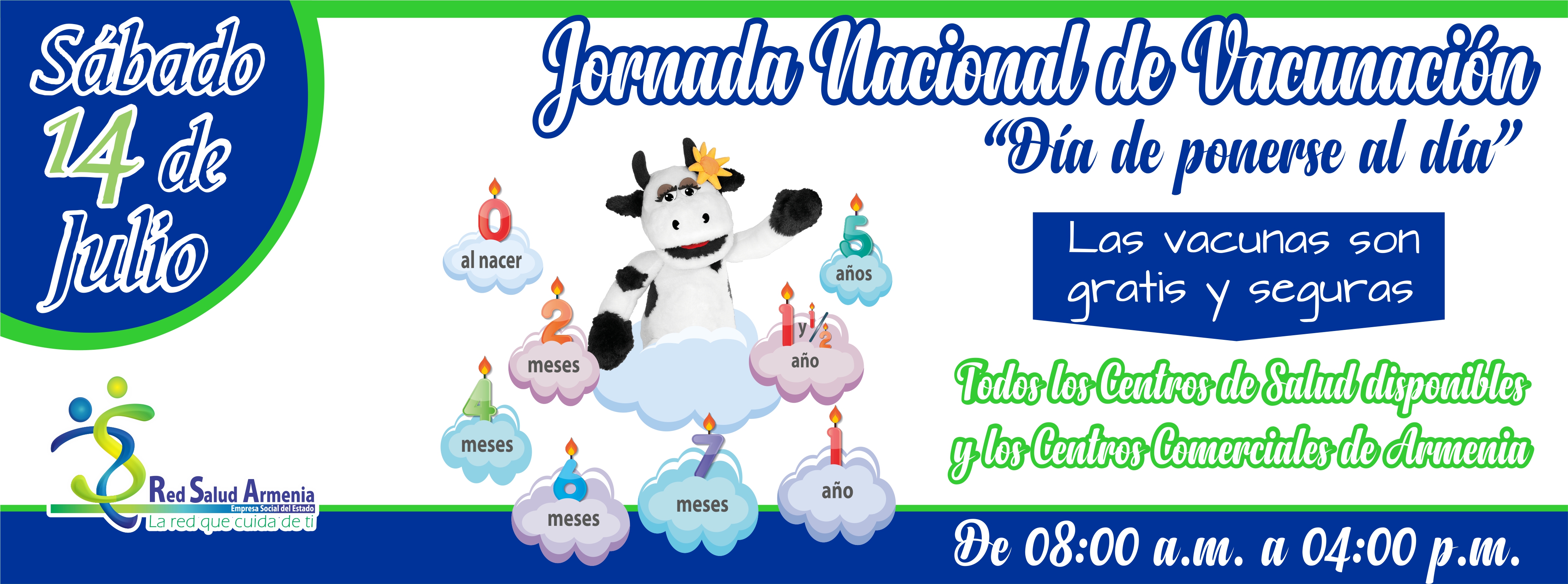 Durante este día, Red Salud Armenia ESE dispondrá, desde las 08:00 AM hasta las 04:00 PM, puntos de vacunación en: los Centros de Salud, el Hospital del Sur, el CAM y en los Centros Comerciales Unicentro, Calima y Portal del Quindío.