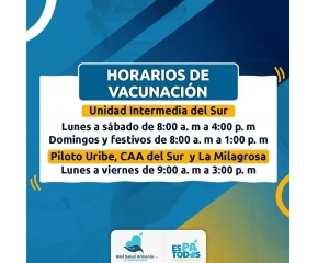 Centro de Salud La Milagrosa Centro de Salud Piloto Uribe Centro de Atención Ambulatoria CAA del Sur Horario: lunes a viernes de 9:00 a. m. a 3:00 p.m. Unidad Intermedia del Sur Horario: lunes a sábado de 8:00 a. m. a 4.00 p.m.) (Domingos y festivos de 8:00 a. m. a 1:00 p. m.) Requisitos Carnet de vacunación Mi Vacuna Documento de identidad