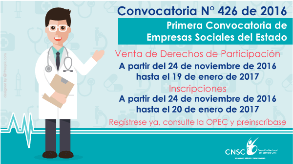 Desde ya los interesados pueden ingresar a consultar los avisos informativos y el acuerdo de la convocatoria en: http://www.cnsc.gov.co/index.php/426-de-2016-primera-convocatoria-empresas-sociales-del-estado