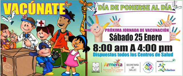 Con la participación de la AlcaldÃa de Armenia, la SecretarÃa de Salud Municipal y Red Salud Armenia E.S.E., se llevará a cabo el sábado 25 de enero desde las 08:00 de la mañana hasta las 04:00 de la tarde, la jornada nacional de vacunación en el municipio de Armenia.