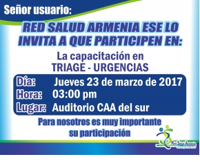 Desde la gerencia de Red salud Armenia ESE se invita a todos los usuarios a la capacitación que se realizará el jueves 23 de marzo del presente año, en el auditorio del Centro de Atención Ambulatoria del Sur (CAA del Sur), ubicado en la carrera 19 No 44 esquina, a partir de las 03:00 pm; allí podrán despejar cada una de las duda que tengan frente al servicio.